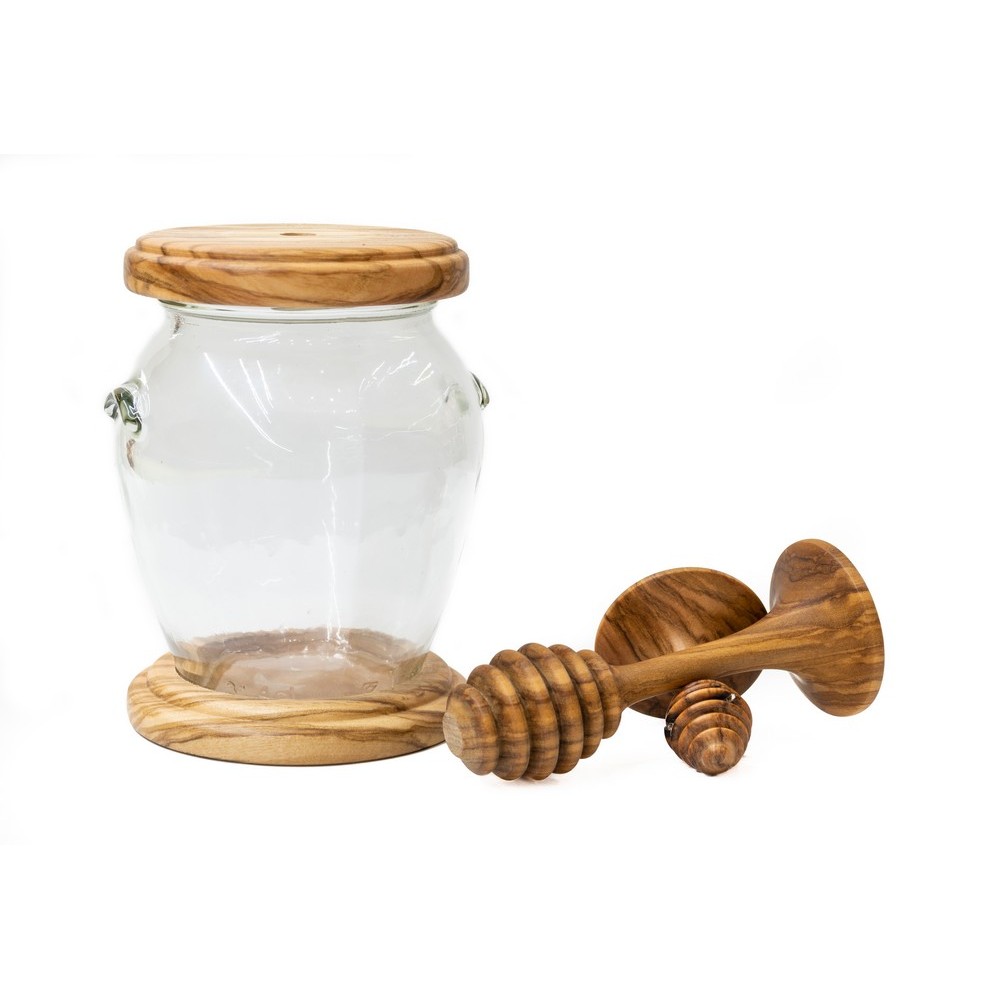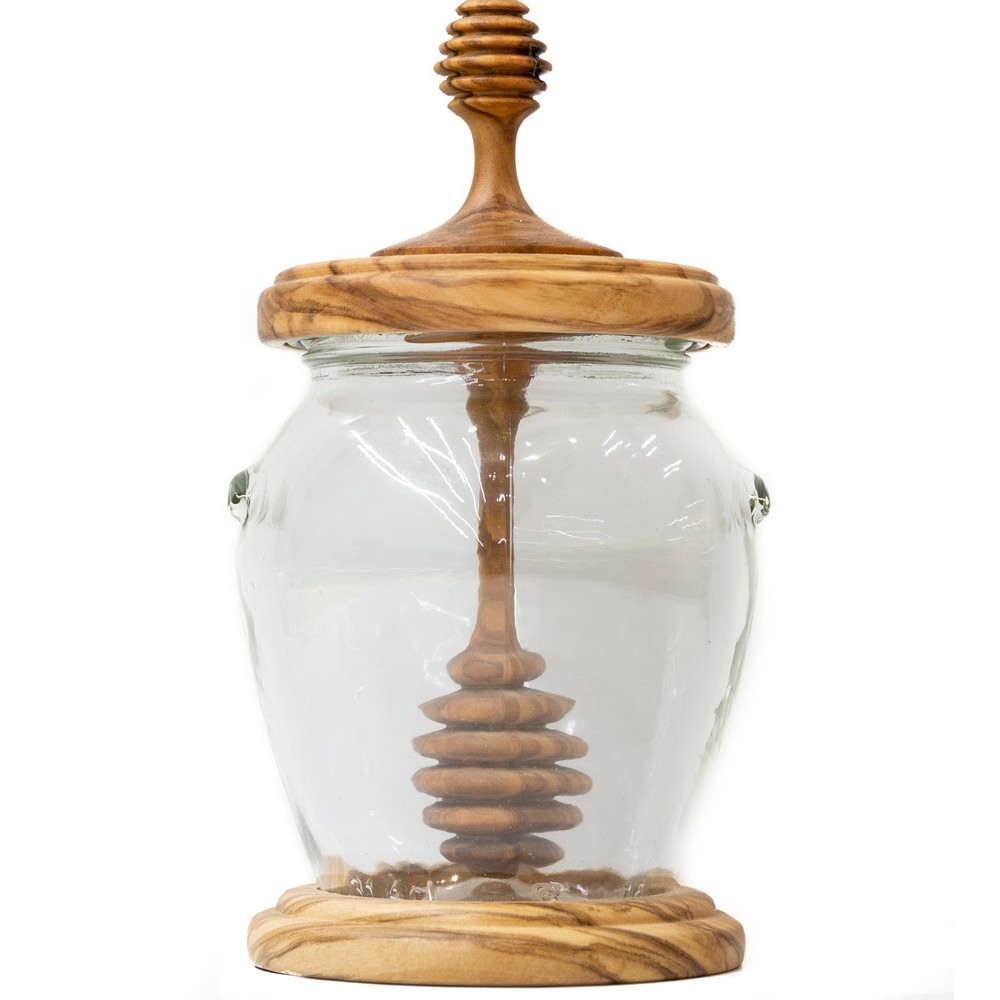 Handmade olive wood and glass honeypot with a honey stick .Height 17 cm.